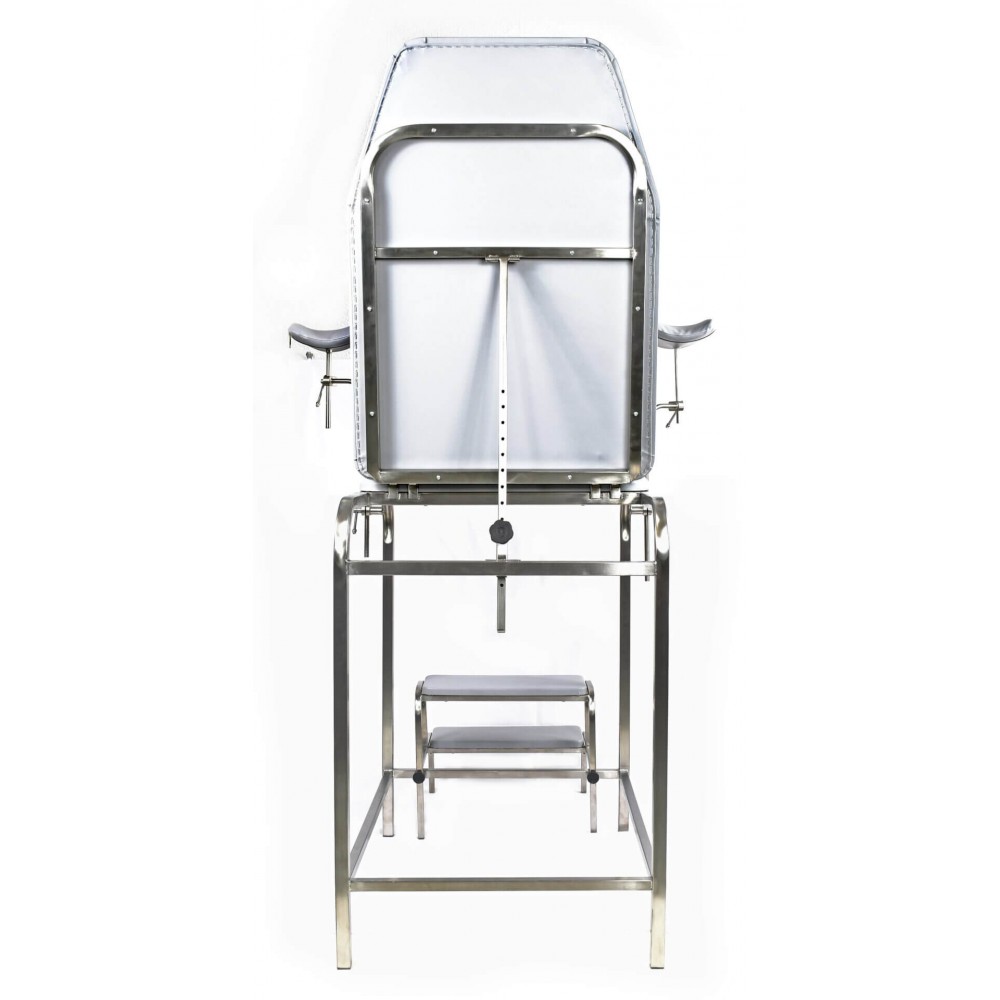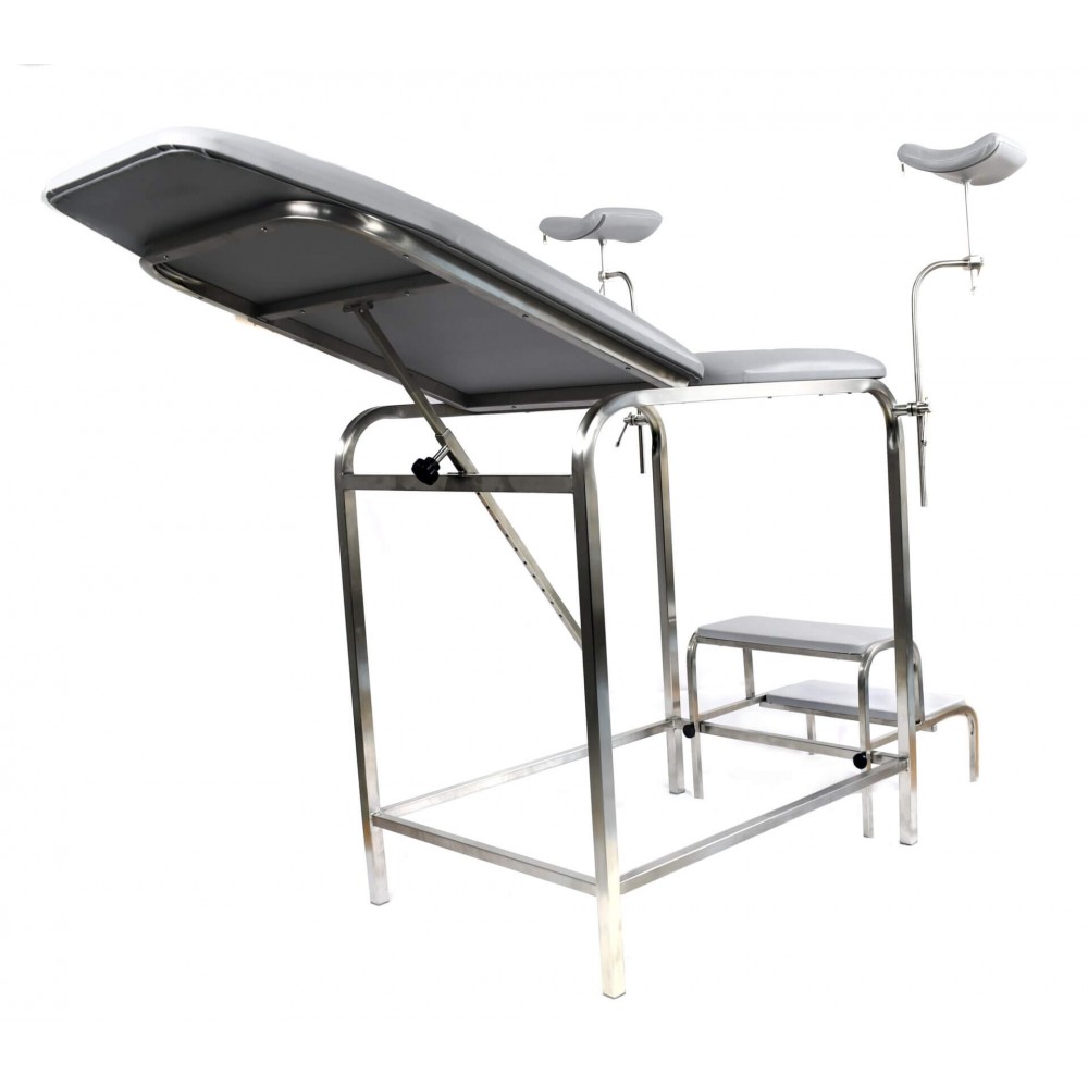 - Регулируемый угол наклона спинки - угол наклона регулируется вручную с помощью направляющей, фиксатора и ручки фиксатора, что позволяет врачу адаптировать положение пациентки к типу манипуляций.