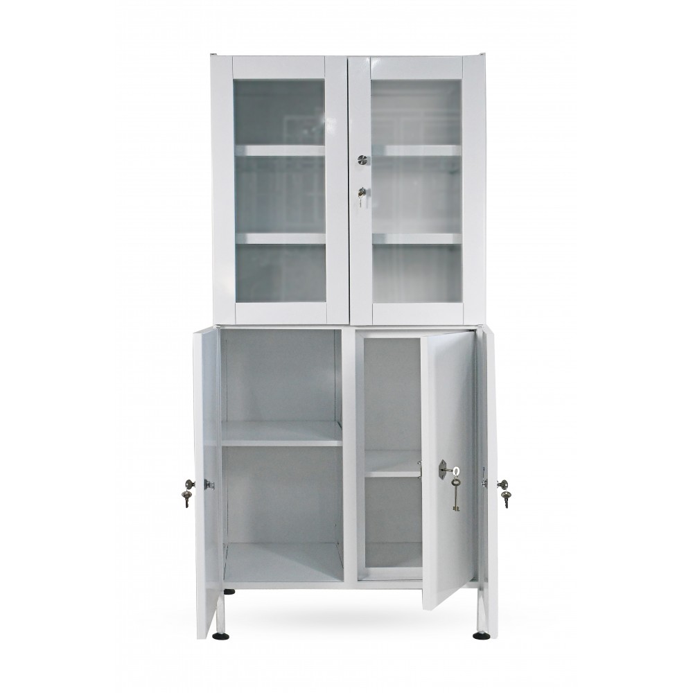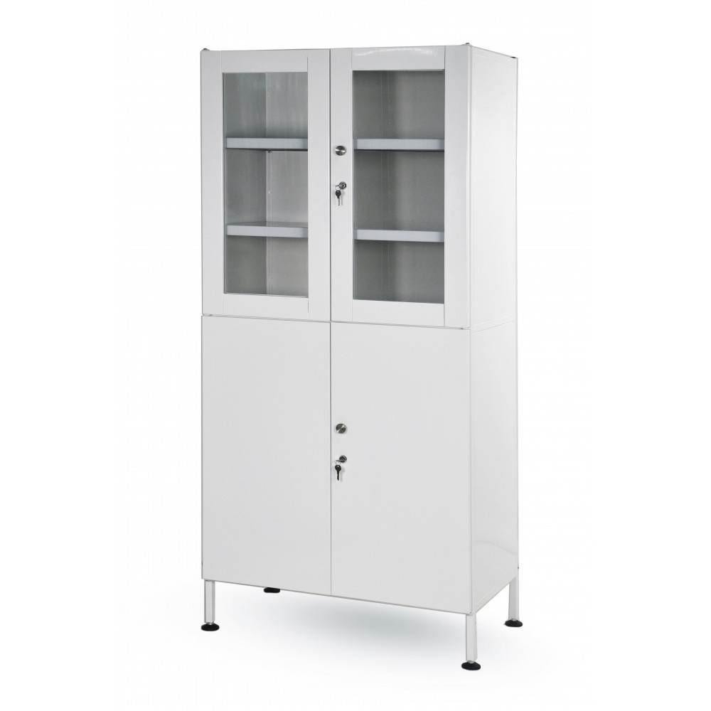 - Прозрачная верхняя дверца для быстрого доступа - выполнена по принципу «сэндвич» из металлического профиля с полимерным антибактериальным порошковым покрытием и вставленным стеклом, что обеспечивает визуальный контроль содержимого без необходимости открывать шкаф.