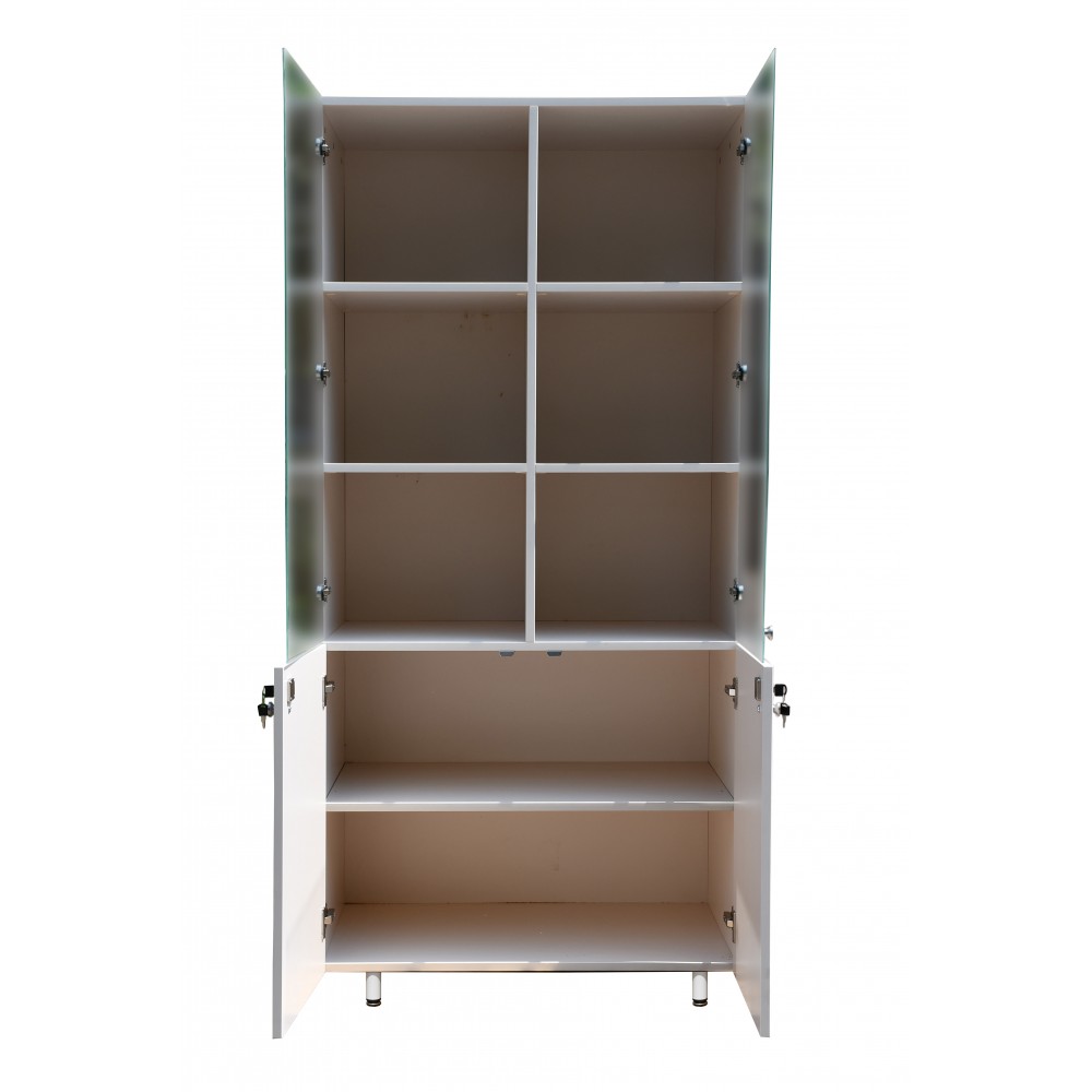 - Двойная система хранения — два независимых отделения: верхнее — с двумя стеклянными дверцами, разделенное вертикальной перегородкой на левую и правую секции, каждая из которых имеет две съемные полки, обеспечивающие удобное зонирование пространства и позволяющие быстро идентифицировать содержимое благодаря прозрачным фасадам; нижнее отделение оборудовано двумя дверцами из ламинированного ДСП и одной полкой.