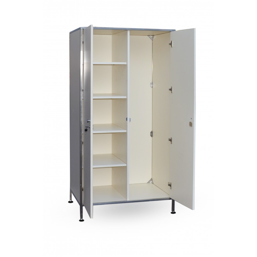 - Двойное зонирование пространства — шкаф имеет два функциональных отделения: правое — со свободным пространством, и левое — с четырьмя полками для удобного и упорядоченного хранения различных медицинских средств и материалов.