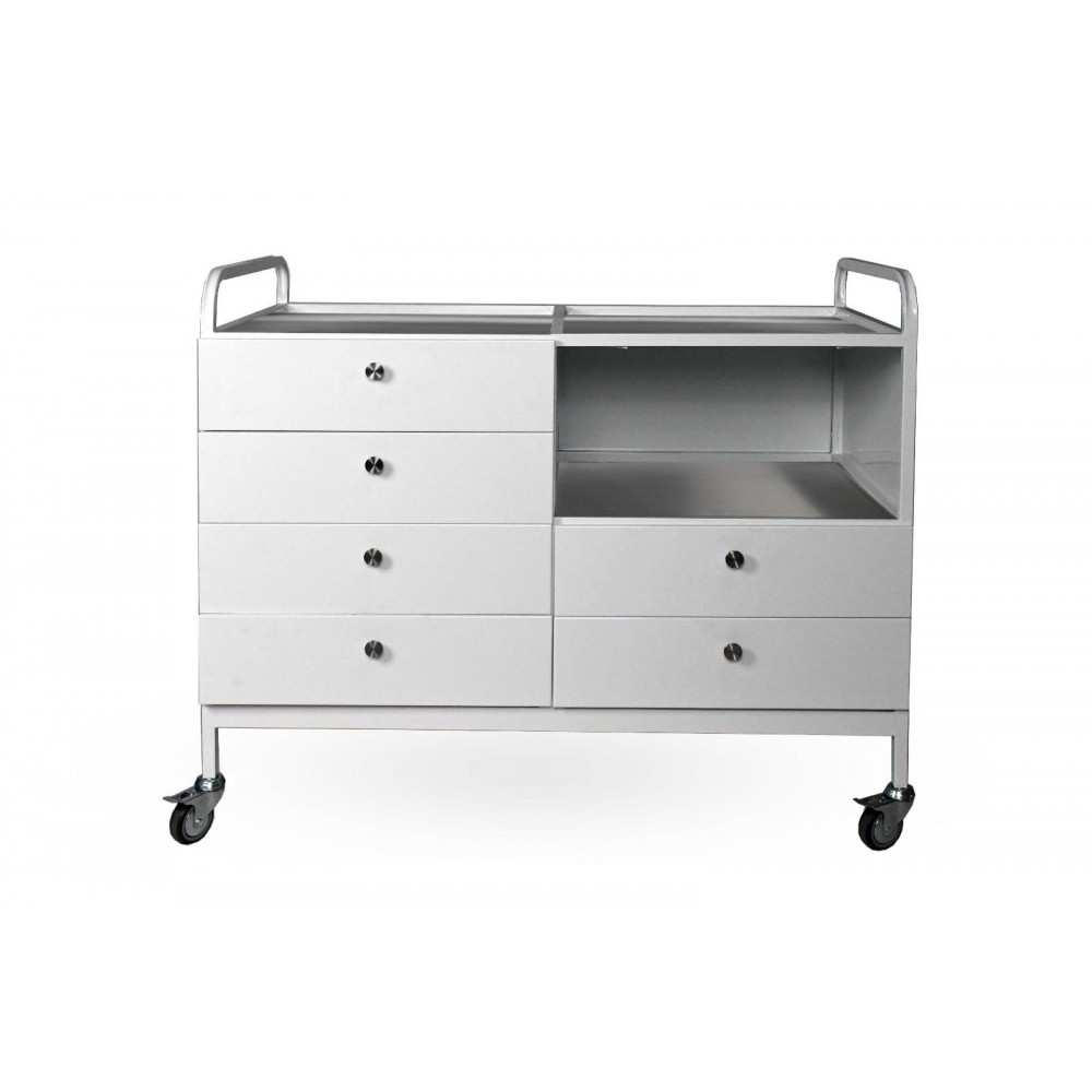 - Функциональные ящики и вместительное отделение – стол оснащен выдвижными ящиками, обеспечивающими удобное хранение инструментов и медикаментов. Между ящиками расположена одна съемная полка, которую можно легко снять или установить в соответствии с потребностями пользователя.