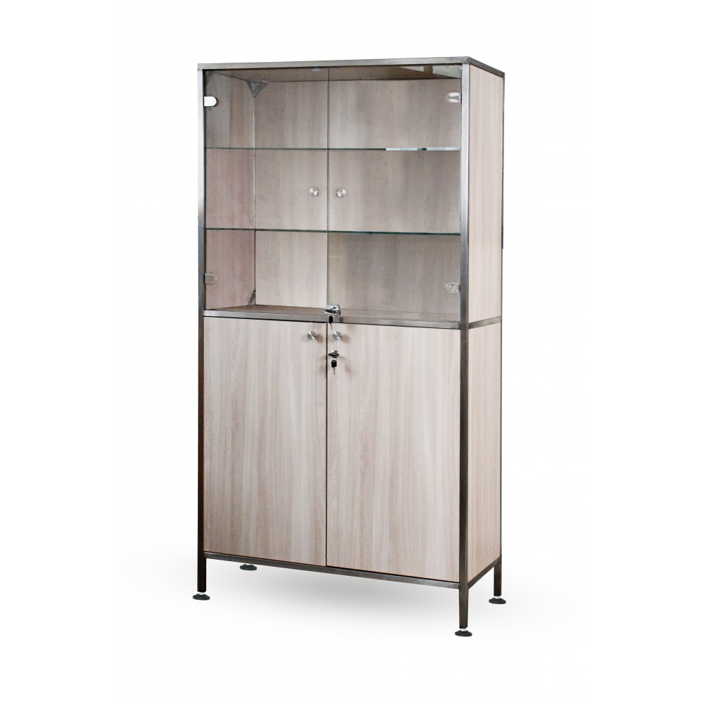 - Поділ на два функціональні відділення - верхнє відділення оснащене двома прозорими скляними дверцятами та двома внутрішніми полицями зі скла, що забезпечують зручний візуальний контроль за вмістом. Нижнє відділення обладнане двома дверцятами та двома міцними полицями з ламінованої ДСП для безпечного зберігання медичних виробів, витратних матеріалів або документації.