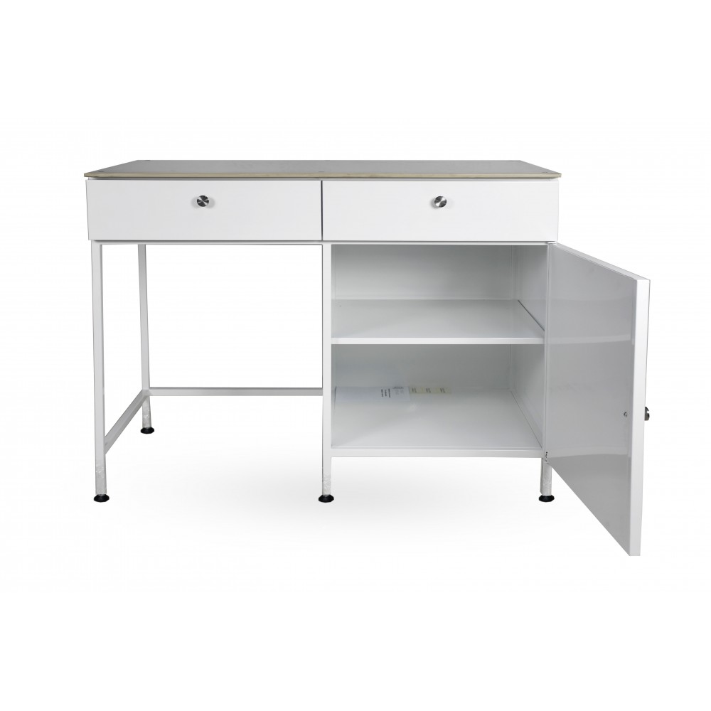 - Функціональність та ергономіка – стіл обладнаний двома висувними шухлядами на телескопічних направляючих, що забезпечують плавне та повне висування, а також тумбою з внутрішньою полицею для зручного зберігання лабораторного приладдя та витратних матеріалів.